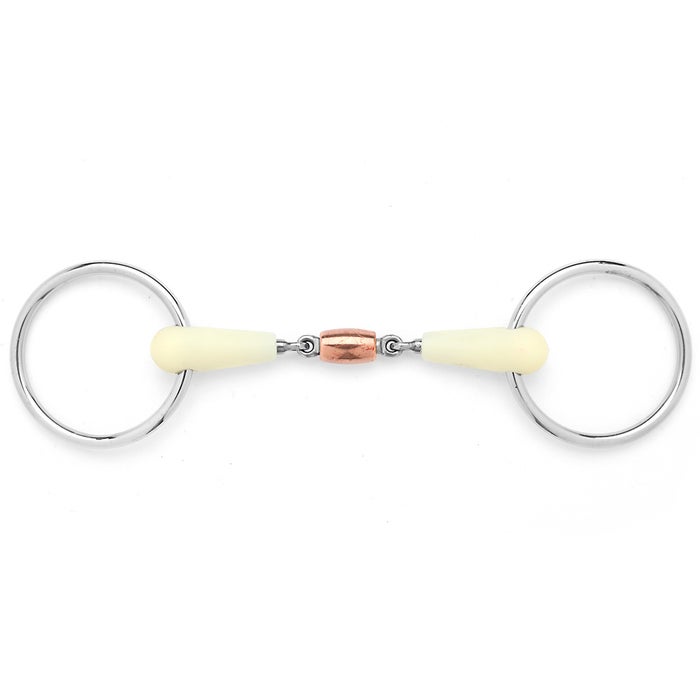 The alternating stainless steel and copper rollers set along the mouthpiece of the snaffle allow the bit to roll up the mouth and help to prevent the horses from grabbing it between the teeth.